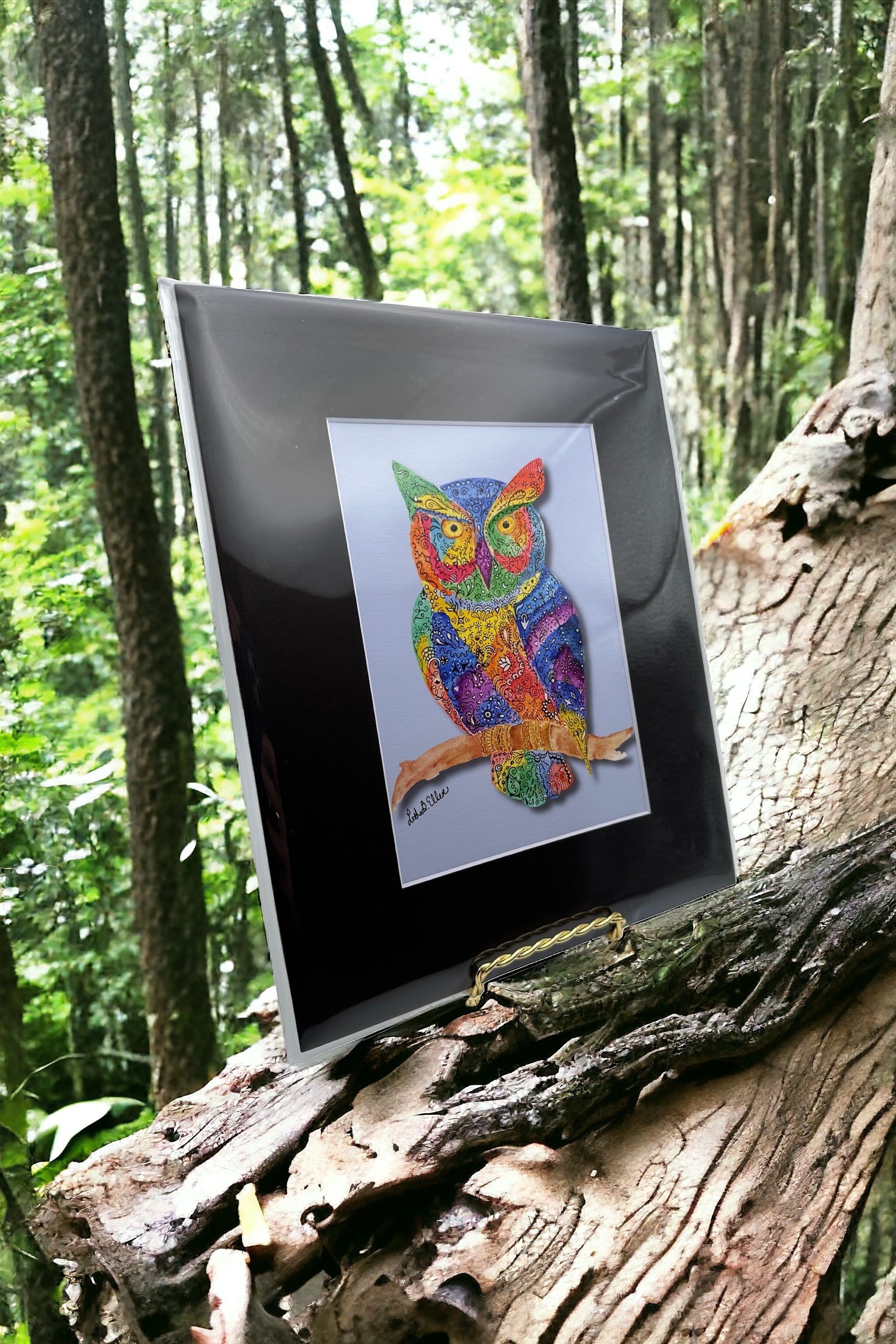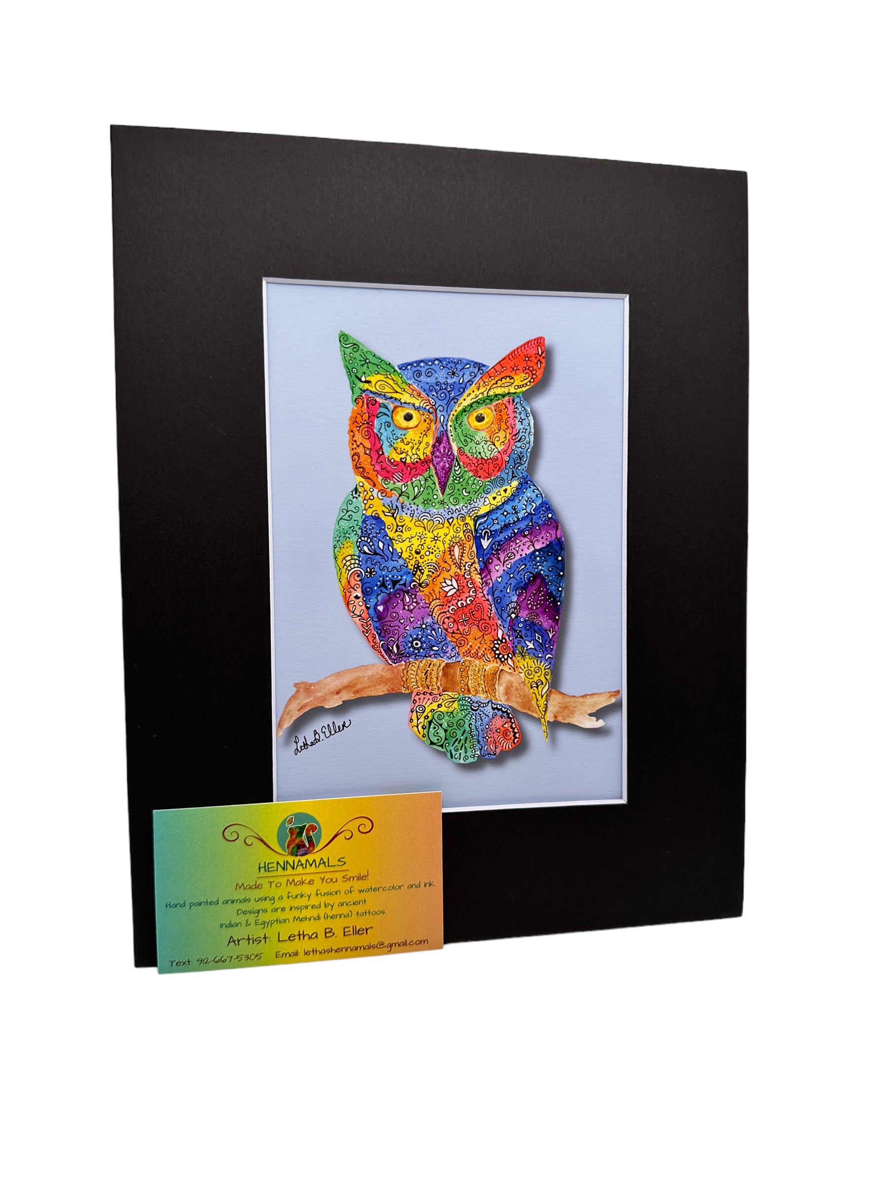 Hang Hooty Owl on your wall and smile every day! Giclee prints are matted with a black mat and backing, then sealed in a plastic sleeve. Three sizes are available which will slip right into a standard frame - 5x7, 8x10, and 11x14.